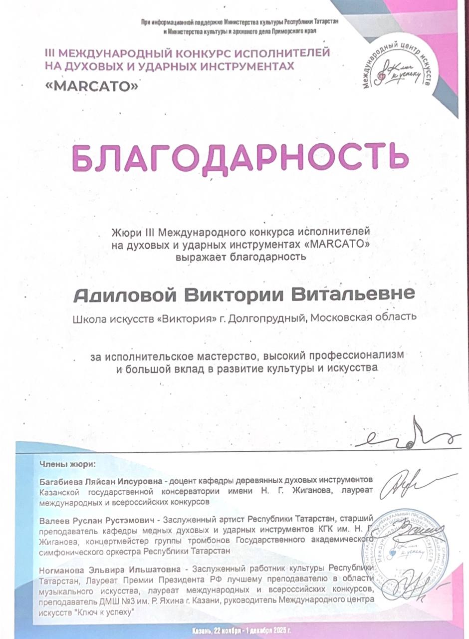 Поздравляем нашего юного исполнителя, его преподавателя Антипкину Викторию Александровну и концертмейстера Адилову Викторию Витальевну с успешным выступлением в конкурсе «MARCATO»: