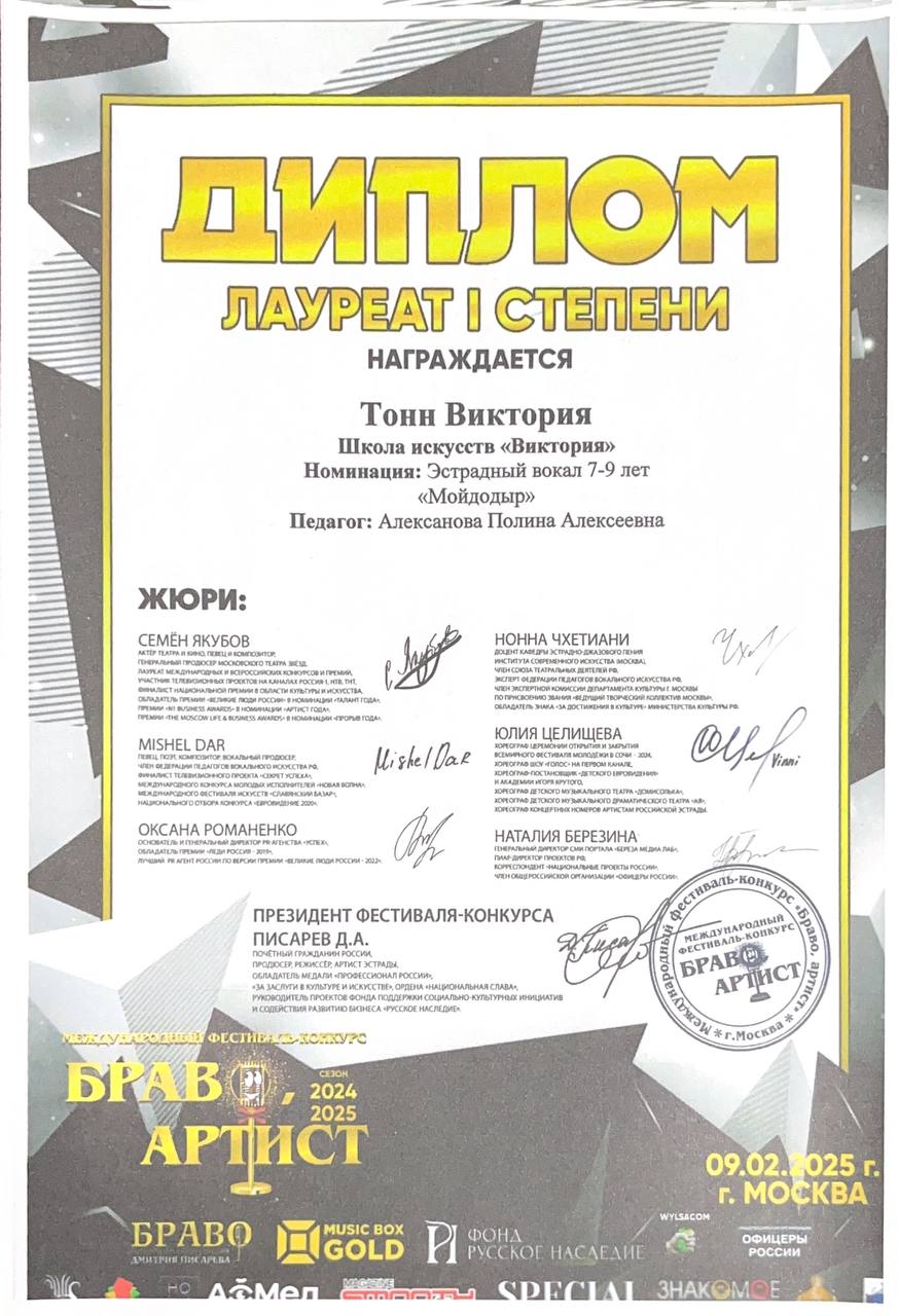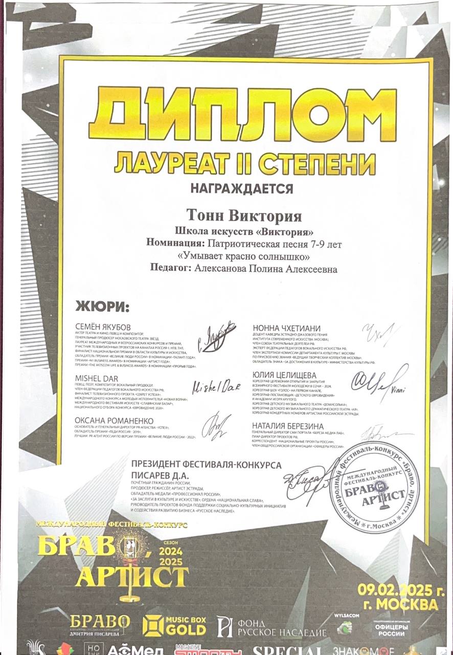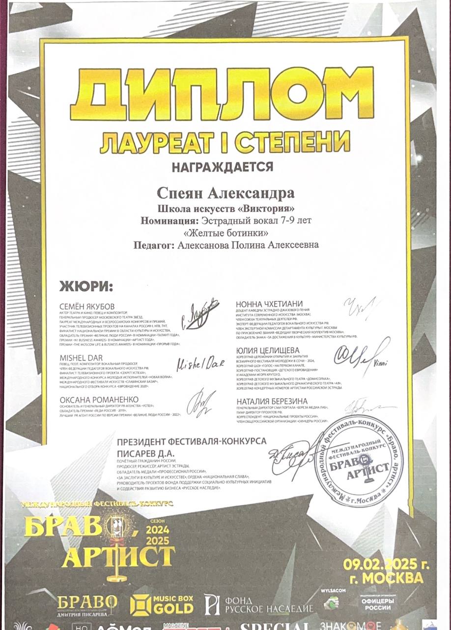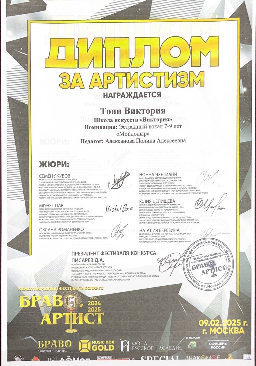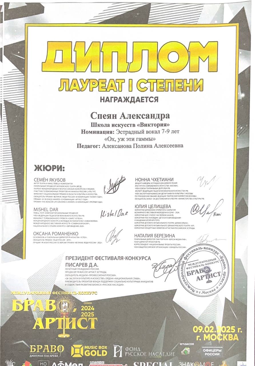 Поздравляем наших юных вокалистов и их руководителя Алексанову Полину Алексеевну с успешным выступлением в фестивале-конкурсе «Браво Артист»: