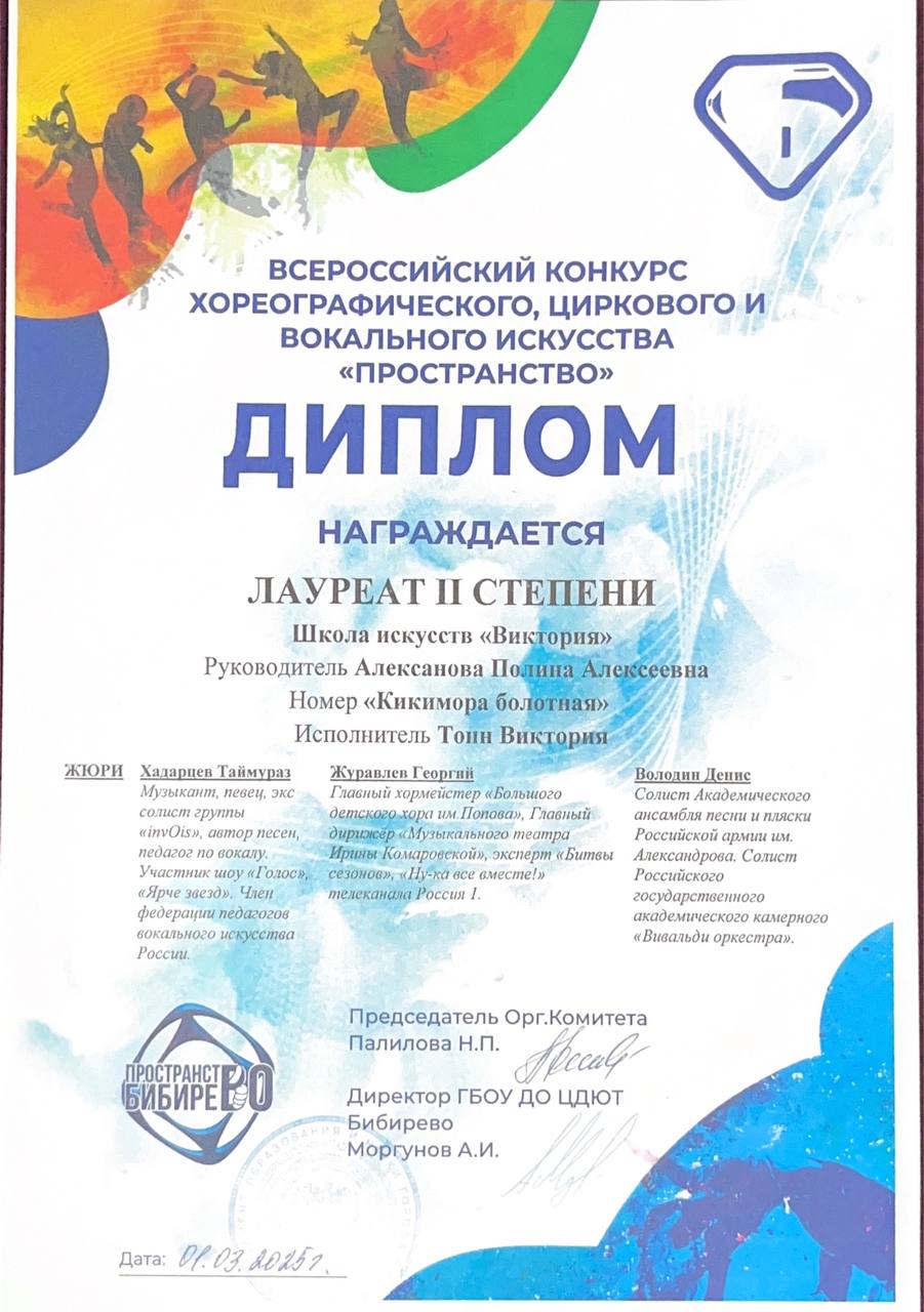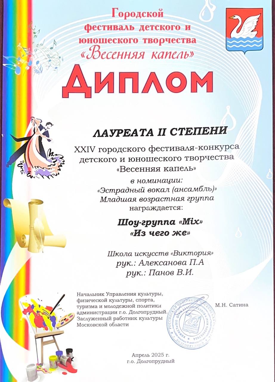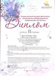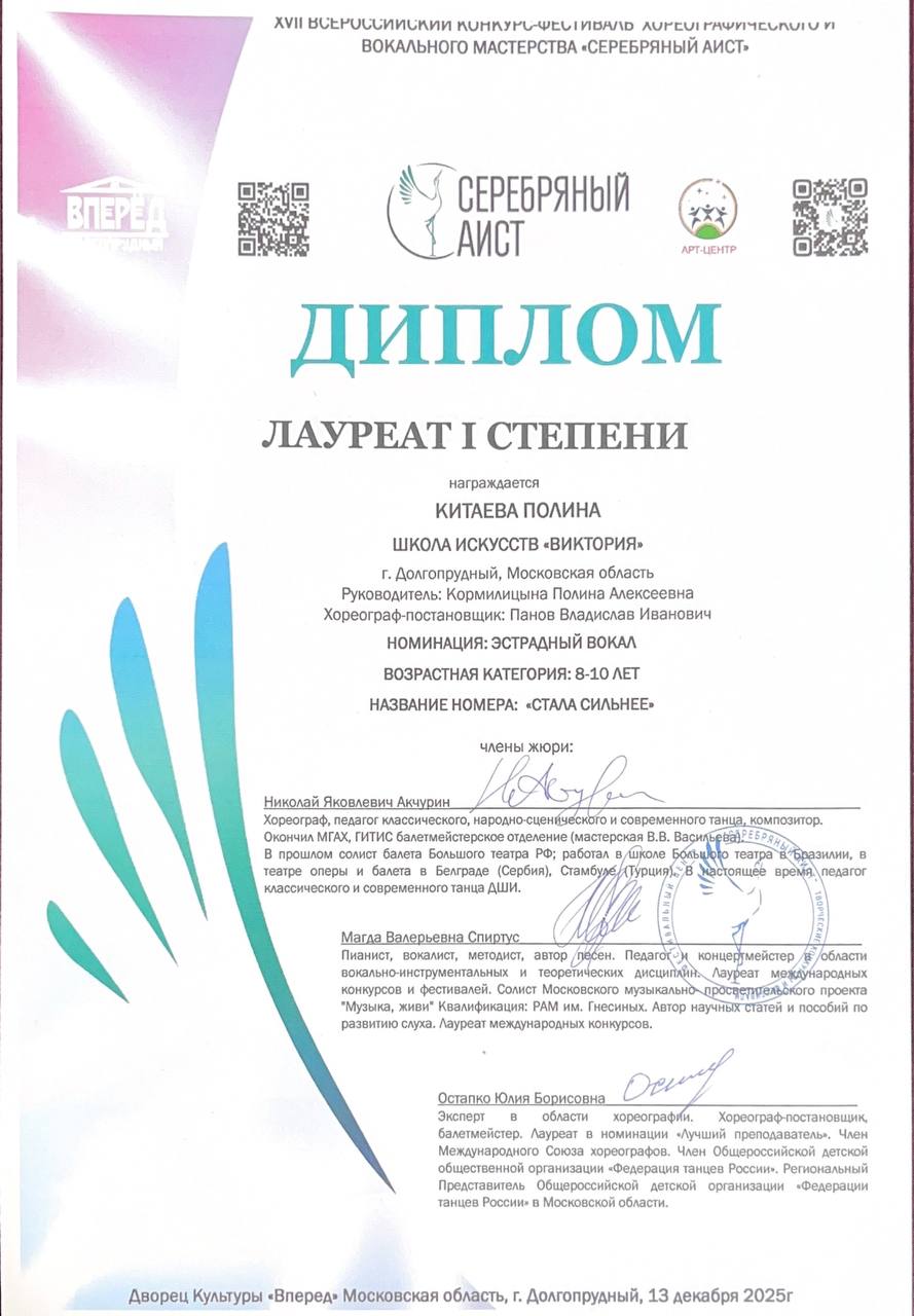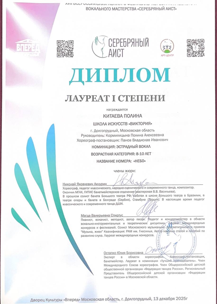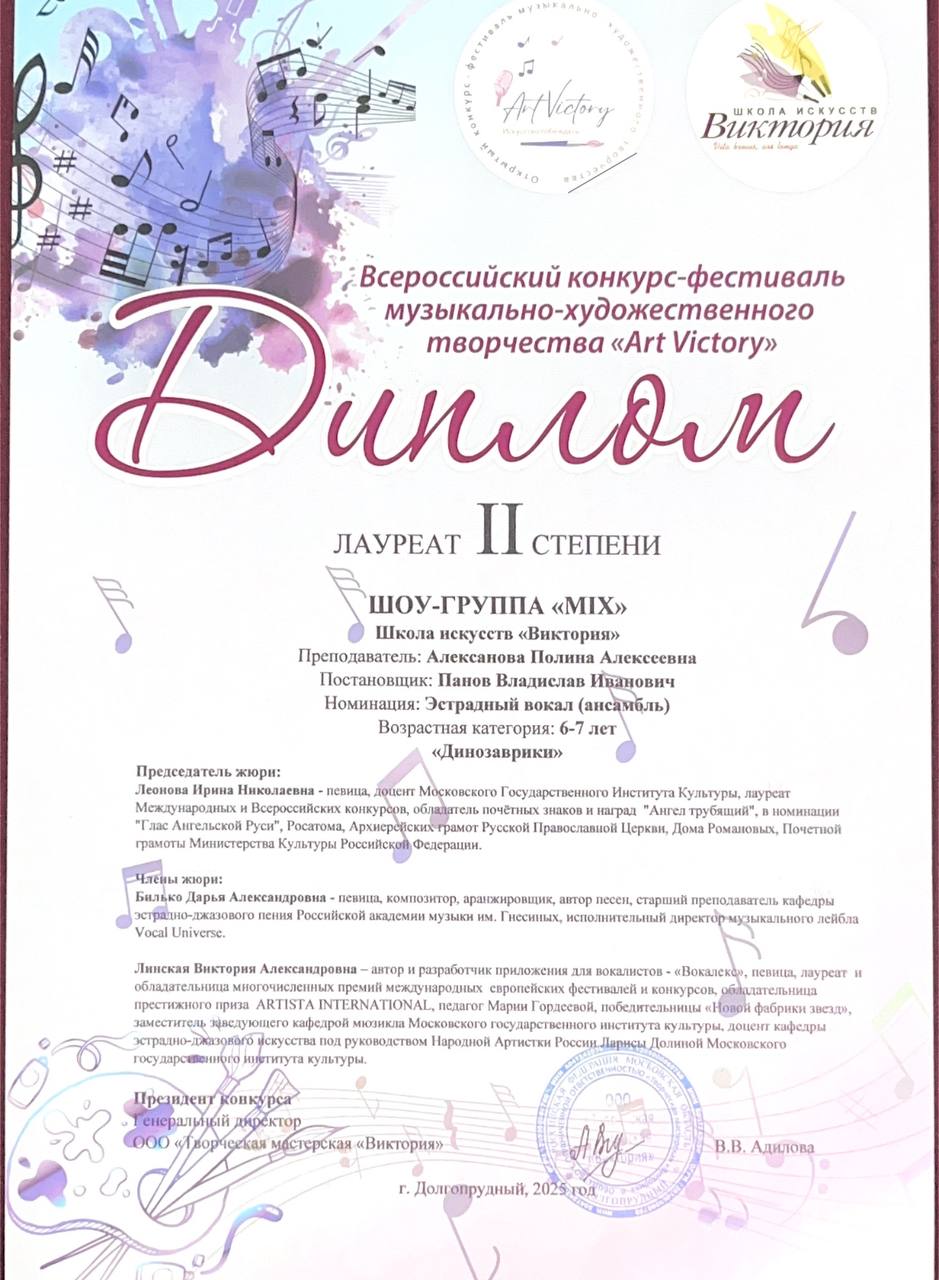 Поздравляем наших юных вокалистов, их педагога по вокалу Алексанову Полину Алексеевну и хореографа Панова Владислава Ивановича с успешным выступлением в конкурсе-фестивале «Art Victory»: