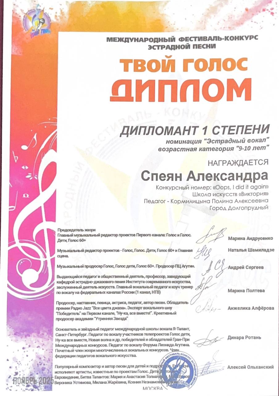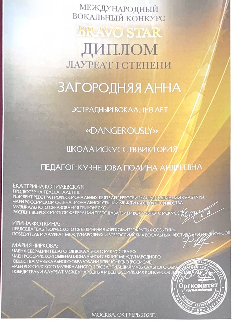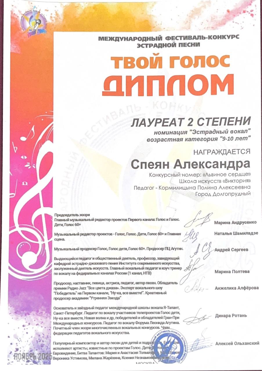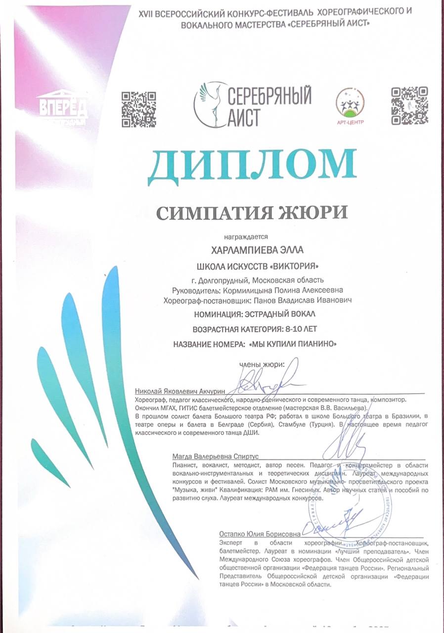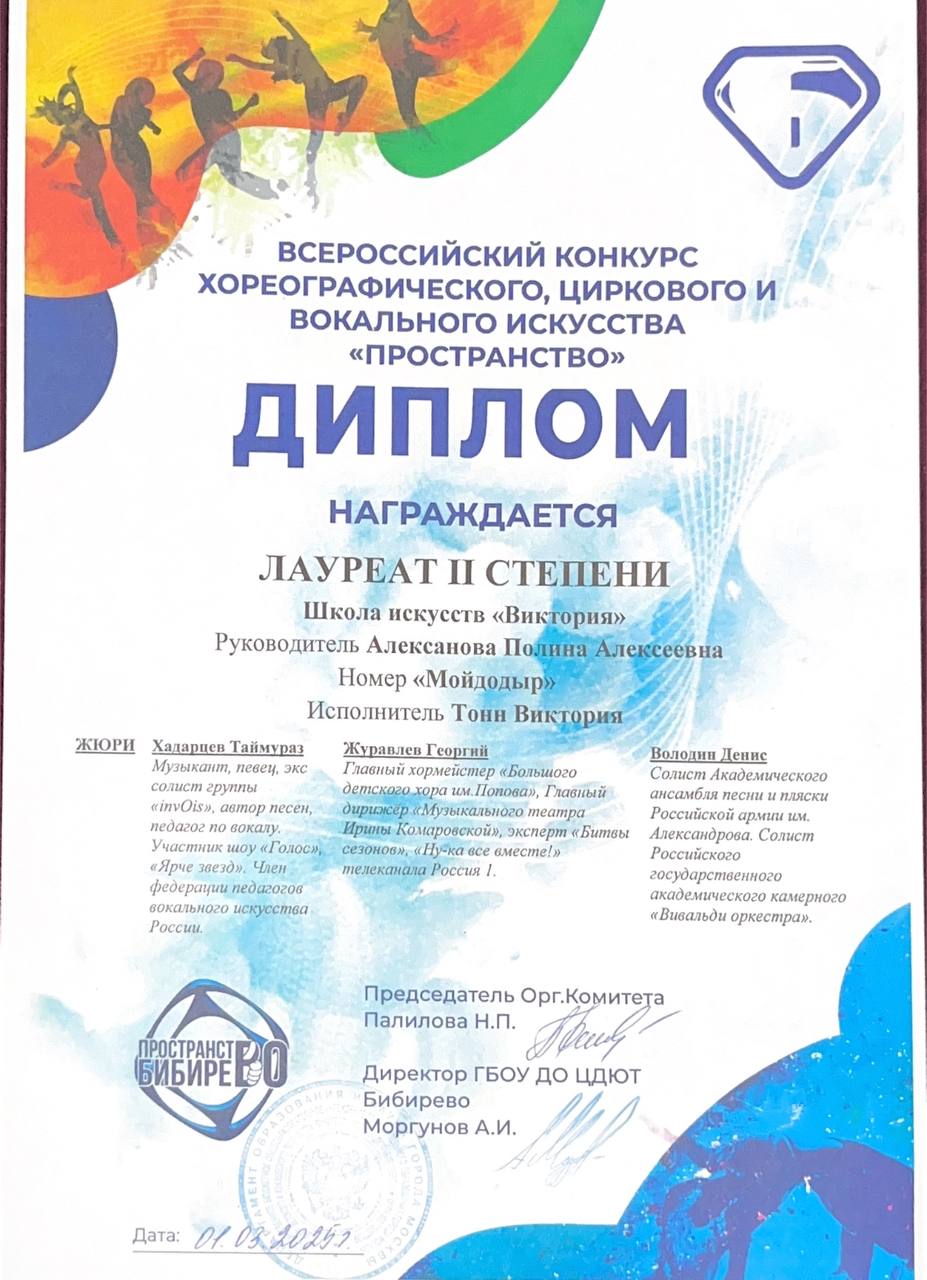 Поздравляем наших юных вокалистов, их педагога по вокалу Алексанову Полину Алексеевну и хореографа Панова Владислава Ивановича с успешным выступлением в конкурсе-фестивале «Art Victory»: